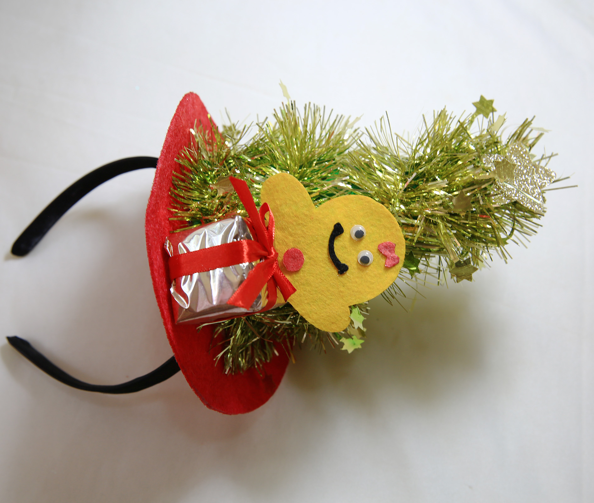 A fun and festive headband featuring an adorable gingerbread man, gift box, and sparkly tinsel