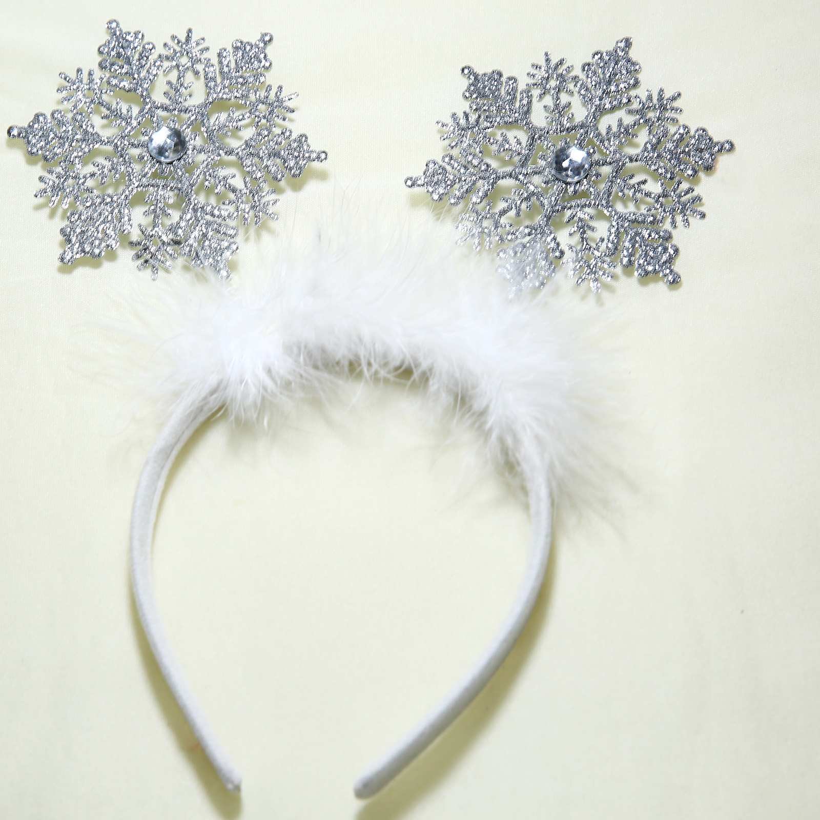 A delicate snowflake headband featuring sparkling acrylic rhinestones and soft white feathers