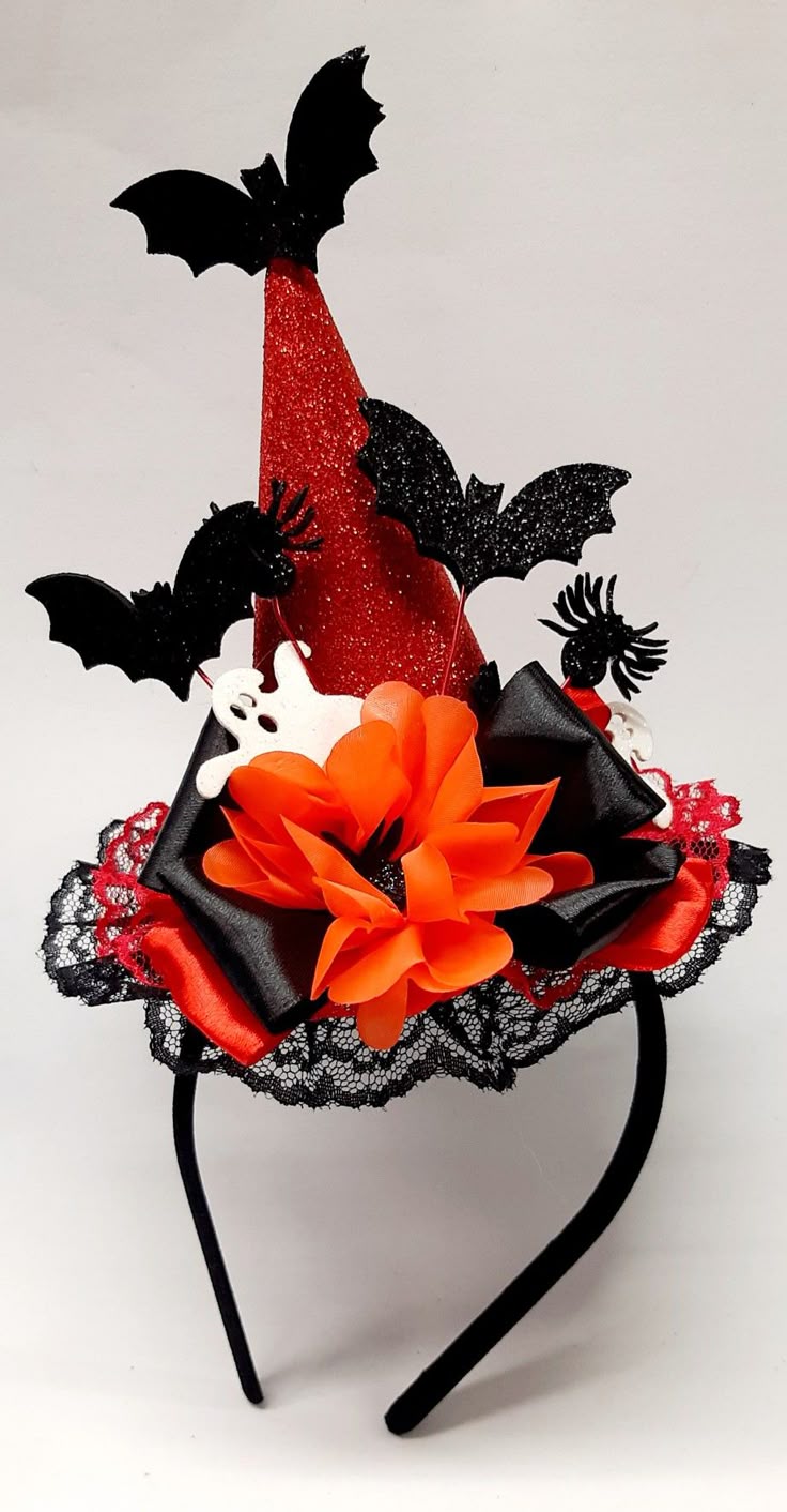 Add spooky charm to your Halloween style with this hat-shaped headband, featuring bats, ghosts, satin florals, and elegant black lace—great for costumes and parties.