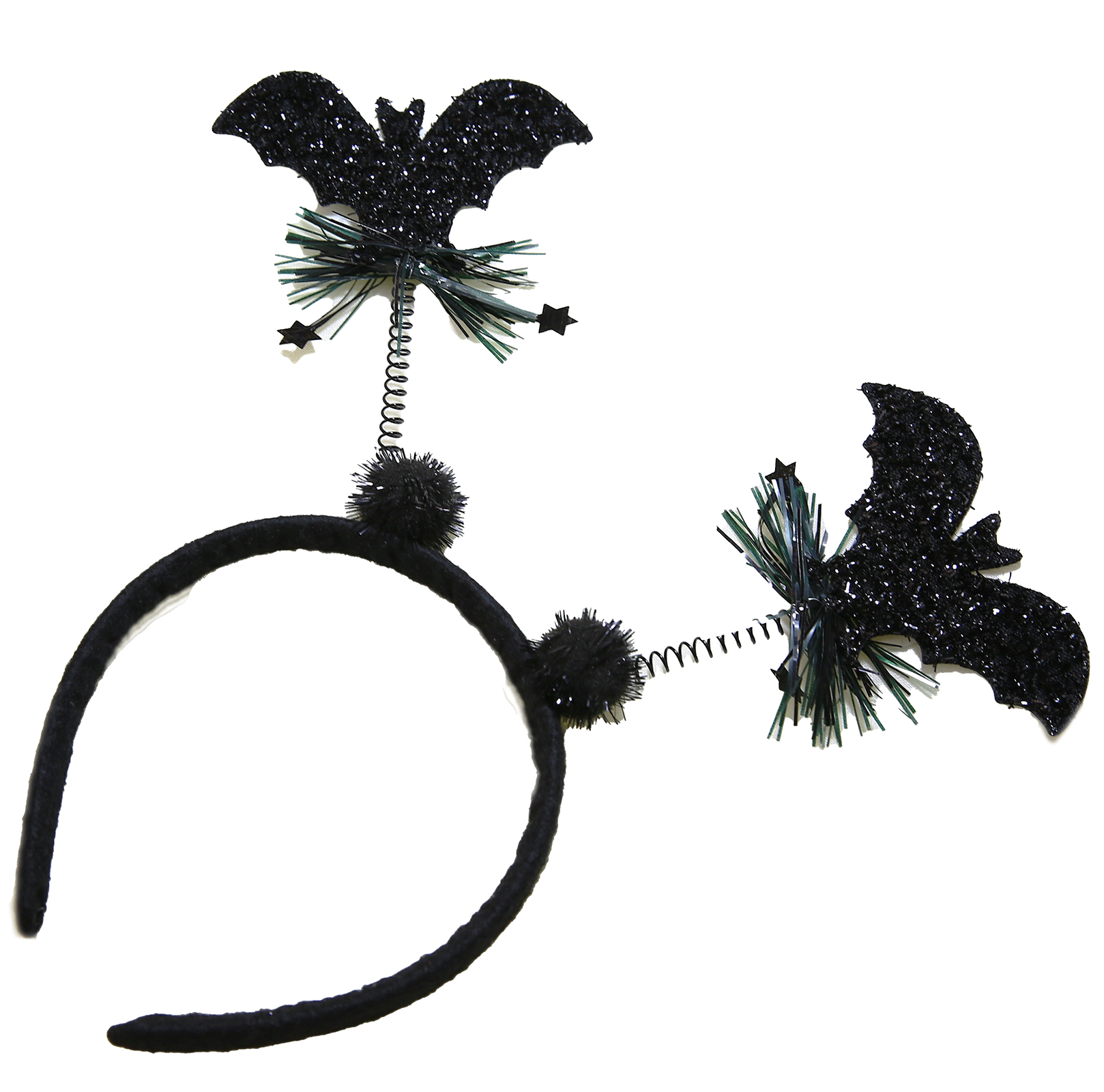 Fun and festive bat spring headband featuring black pom-poms, fluffy feather tinsel, and bouncing bat accents